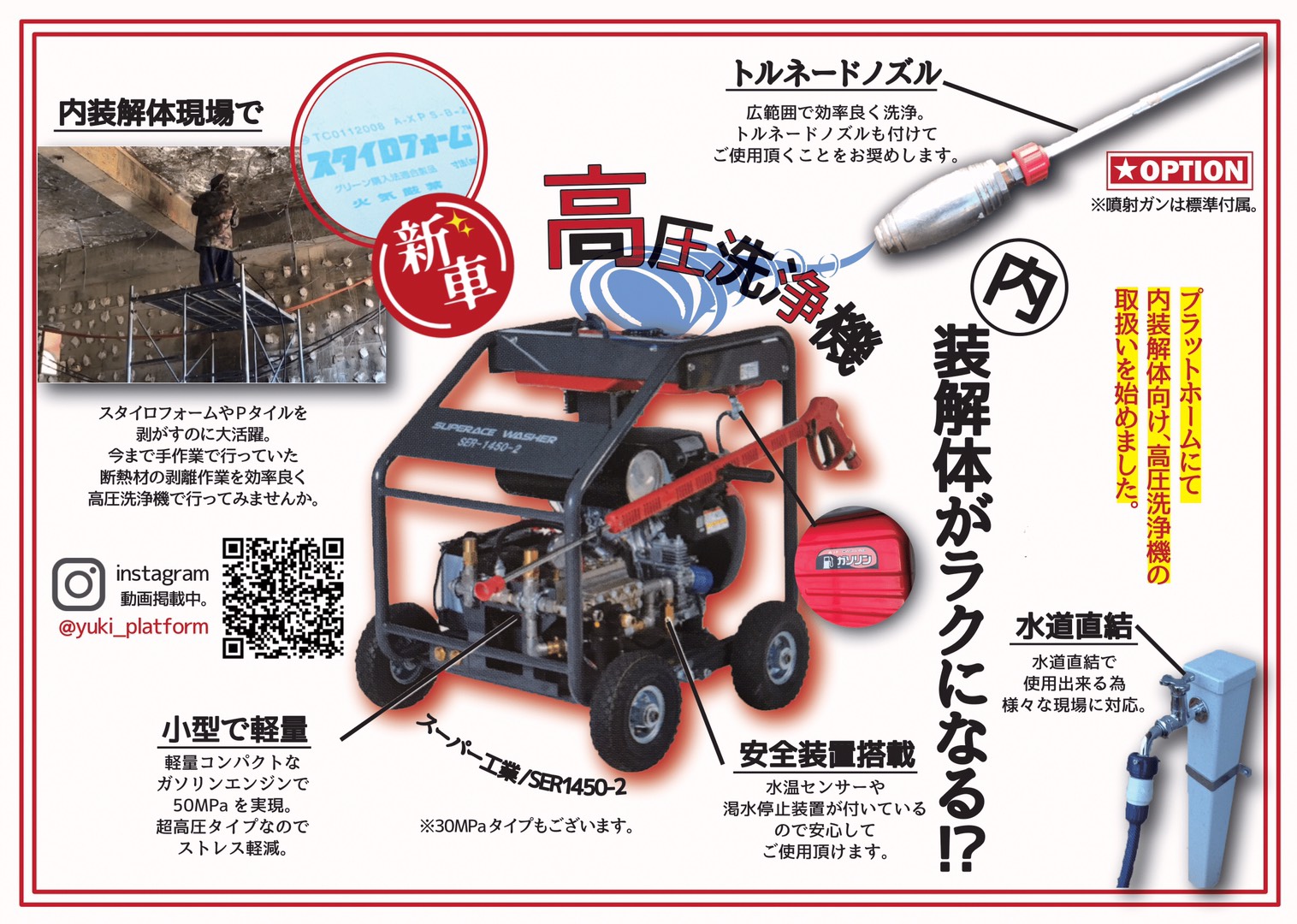 内装解体向け高圧洗浄機 建機プラットホーム