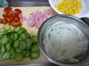 キュウリ トマトのサラダとマカロニサラダ 色々なサラダ